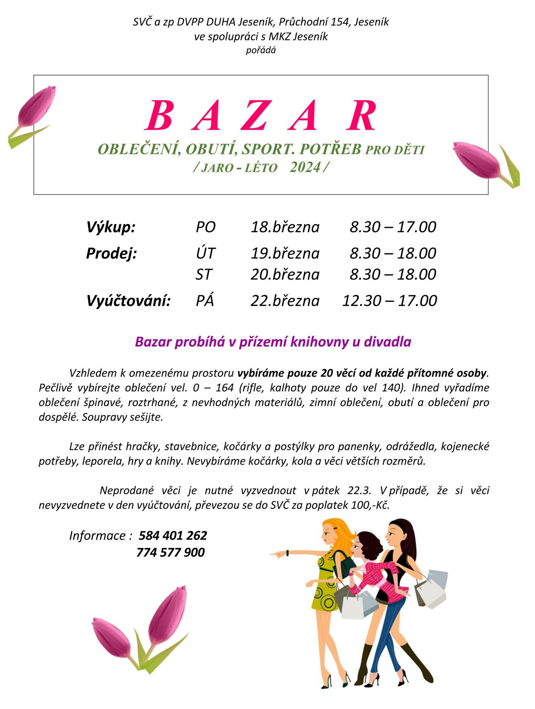 BAZAR jaro - léto 2024 06.02.2024 | AktuálněOblíbený bazar dětského oblečení, obuvi, sportovních potřeb, hraček, knížek a věcí pro děti proběhne od 18.3. v přízemí jesenické knihovny. Akci pořádá DUHA Jeseník ve spolupráci s MKZ Jeseník.