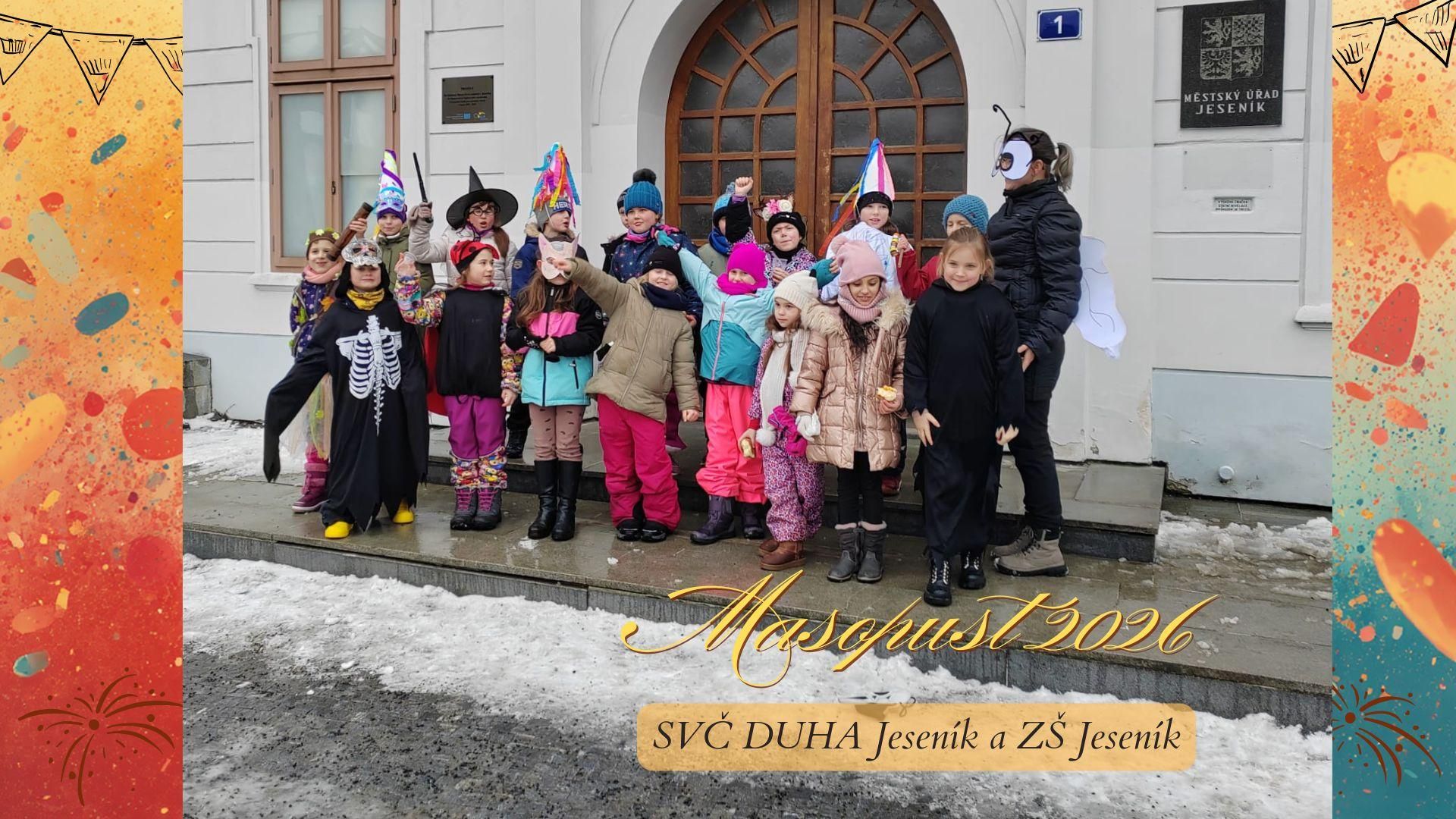 V úterý 17. 2. se uskutečnil tradiční masopustní průvod. V areálu SVČ DUHA Jeseník se sešly děti ze školní družiny ZŠ Průchodní, děti z kroužků DUHY i široká veřejnost. V průvodu nechyběly nejrůznější masky, a to včetně těch tradičních, jako je medvěd, laufr či kobyla. Průvod vyšel od ZŠ Průchodní směrem do parčíku u Staříče, kde se připojily děti ze ZŠ ZŠ Boženy Němcové Jeseník.