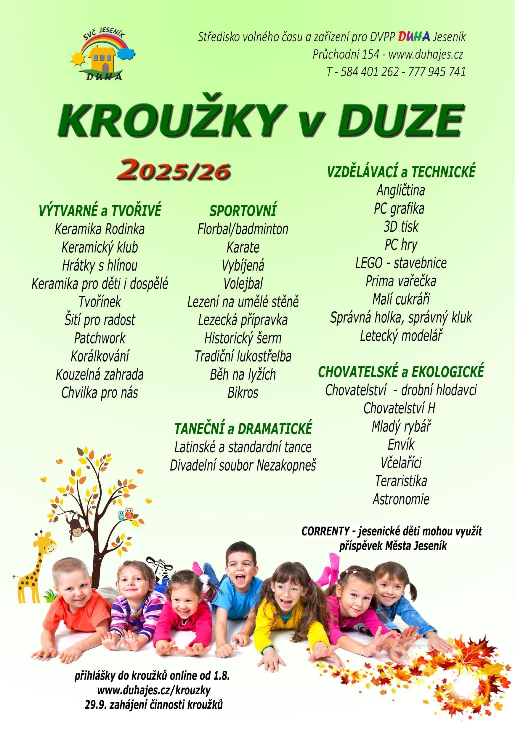 Jarní prázdniny v DUZE 10.01.2026 | Aktuálně Jarní prázdninový program pro děti v DUZE. Přihlášky od 12. do 28.1. na www.duhajes.cz, minimální účast 6 dětí. | |