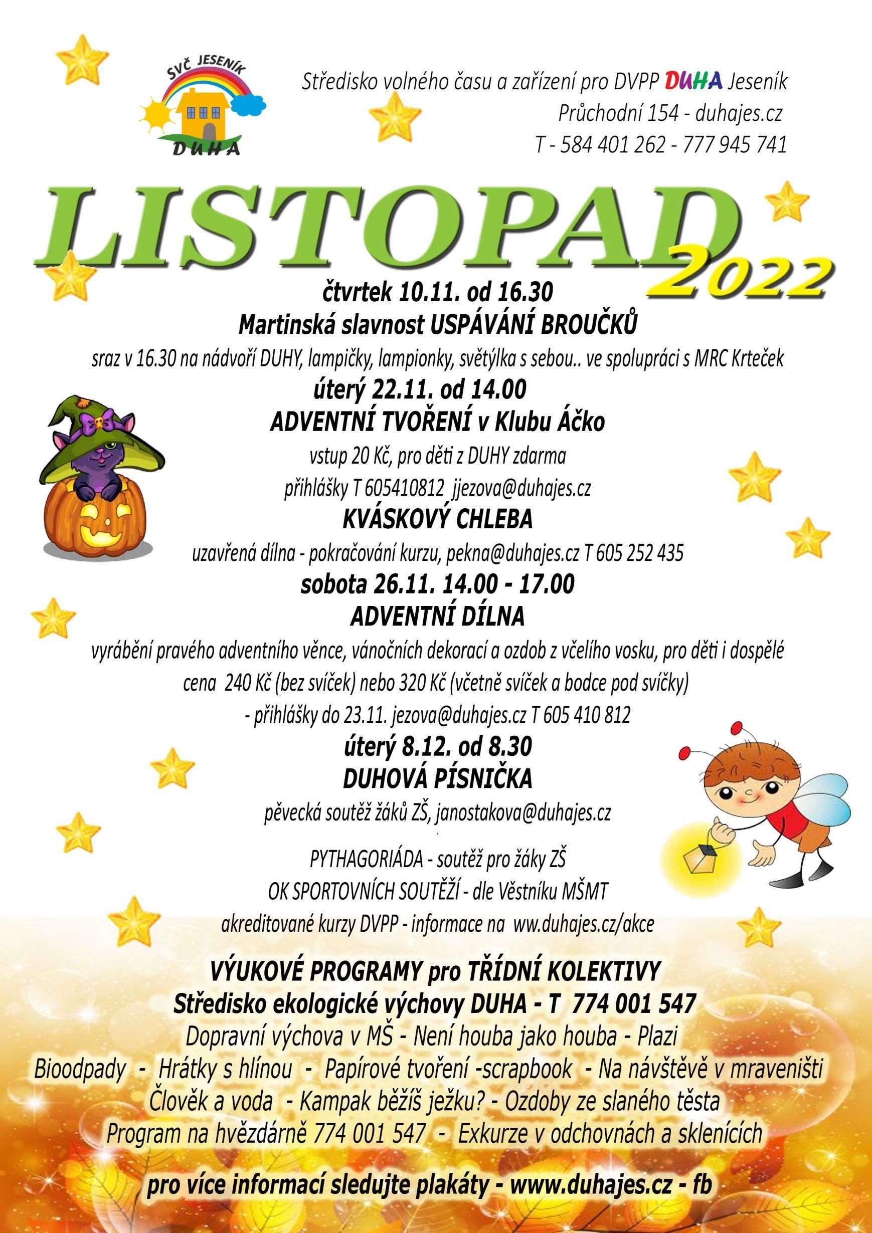 Zveme vás na listopadové akce DUHY 03.11.2022 | AktuálněSrdečně zveme děti, dospělé i školní kolektivy na listopadové akce DUHY. Pro nejmenší děti chystáme lampionový průvod městem - Uspávání broučků. Během školního roku můžete také naskočit do kroužků - v některých jsou ještě volná místa..