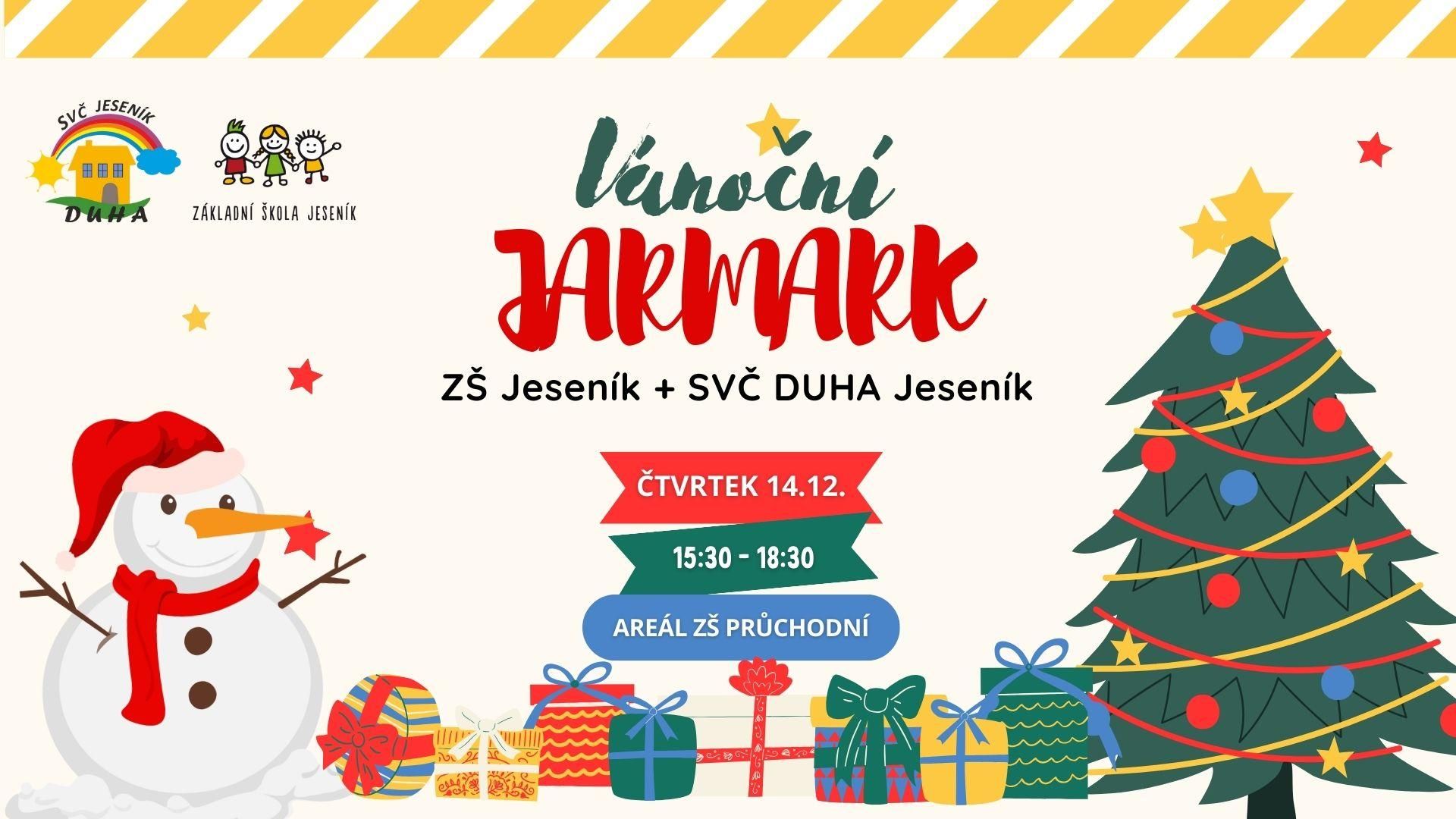 Vánoční jarmark ZŠ Jeseník + SVČ DUHA Jeseník. Vystoupení dětí ZŠ a SVČ DUHA, prodej vánočních výrobků dětí i dospělých, cukroví, keramika, svícny a vánoční dekorace... 17:00 vyhodnocení soutěže Nejlepší cukroví našich babiček (recept + 10ks cukroví přineste do DUHY do 14:00 v den Jarmarku).