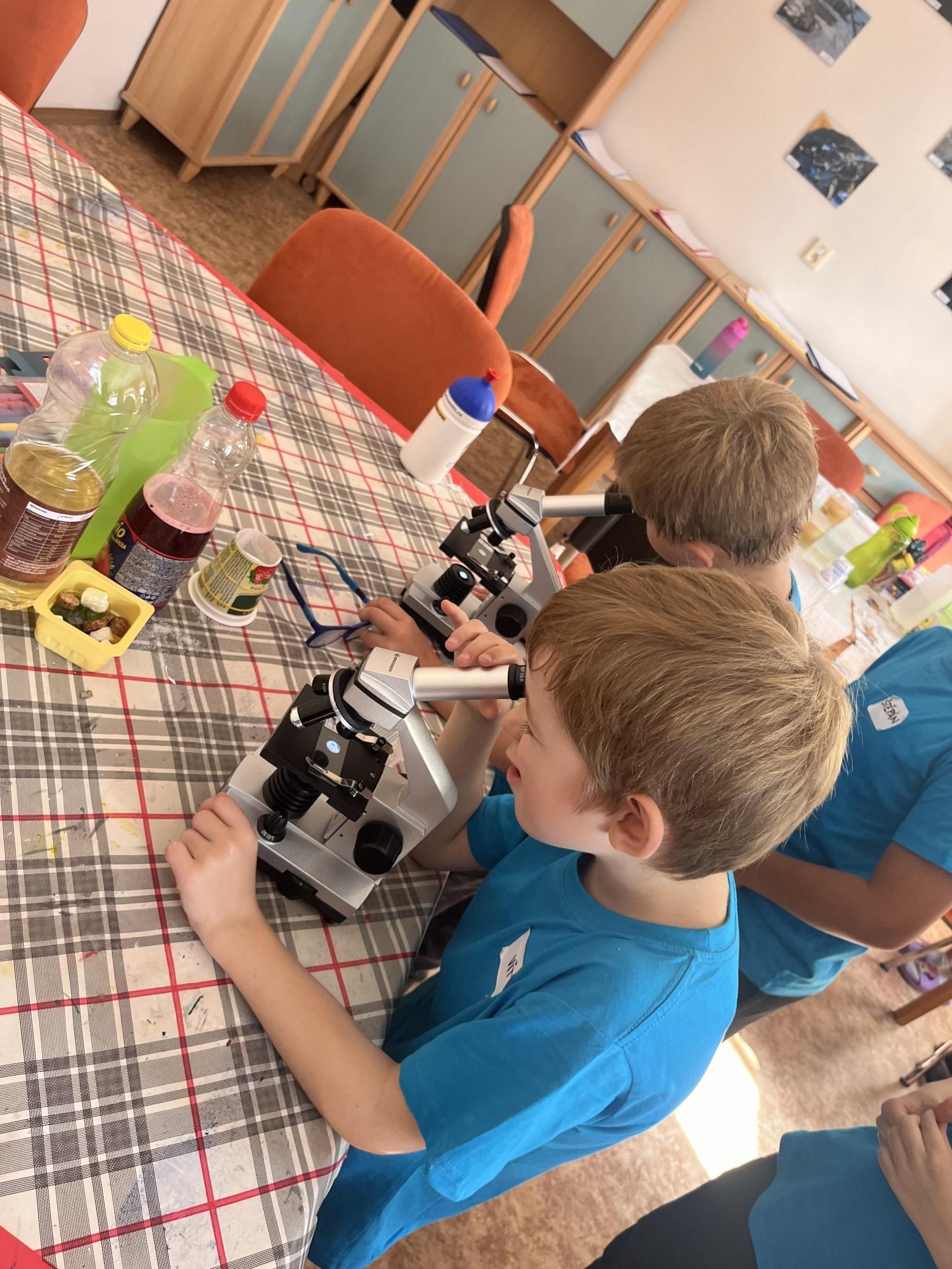Jako správní vědci jsme používali i lupu a mikroskop. Všechny výsledky jsme zaznamenávali do vědeckých zápisníků. Našli jsme během bádání čas i na sportovní aktivity, jízdu na koních i návštěvu Večerníčkovy herny ve Vodní tvrzi.