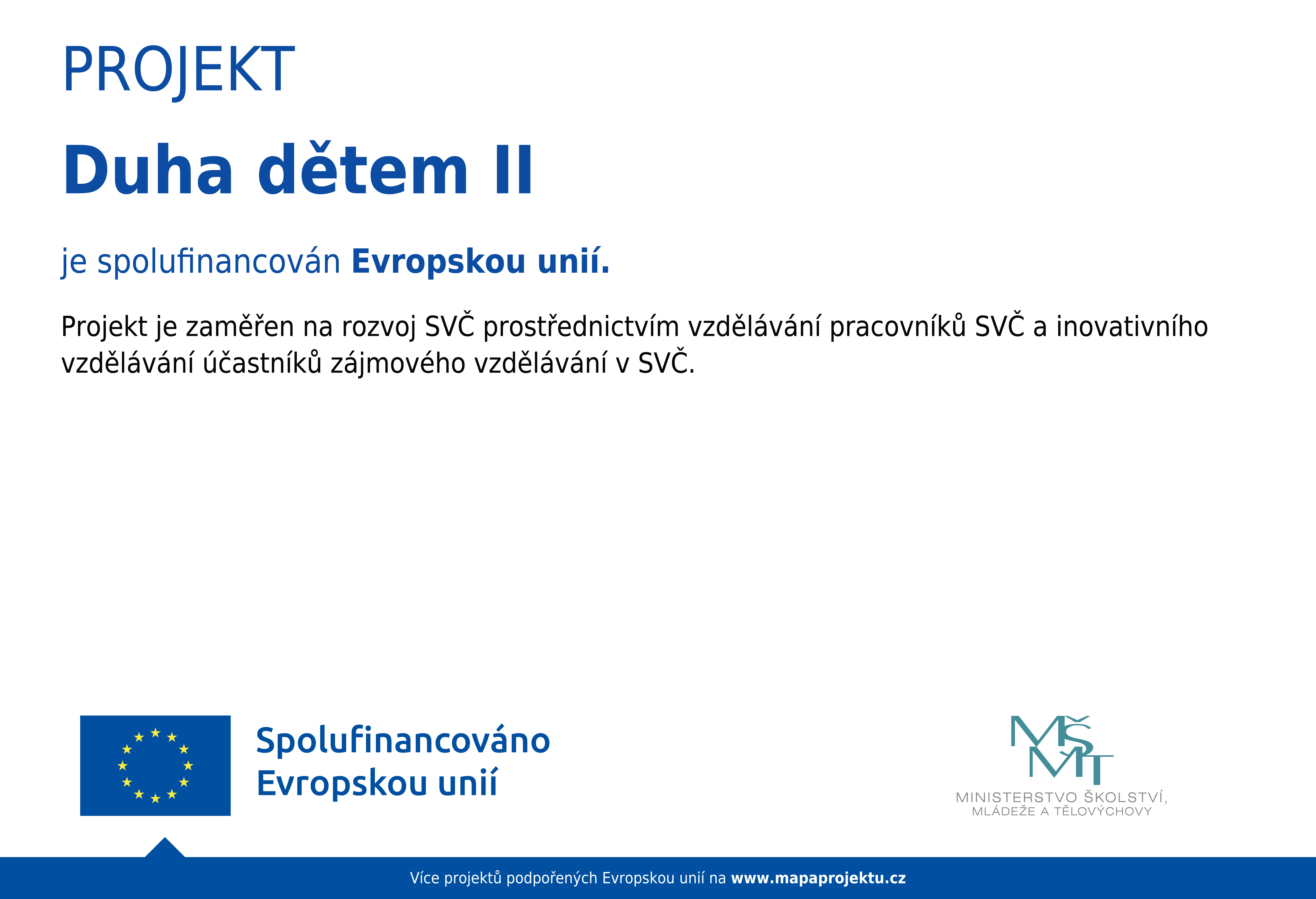 Šablony DUHA dětem II.Středisko volného času DUHA Jeseník realizuje Projekt Duha dětem II. Tato iniciativa, která je spolufinancována Evropskou unií, si klade za cíl posunout kvalitu zájmového vzdělávání na novou úroveň prostřednictvím moderních metod a profesního růstu pedagogických pracovníků. Hlavním pilířem projektu je rozvoj instituce SVČ, a to ve dvou základních rovinách: Vzdělávání pracovníků - pedagogové a další pracovníci SVČ získají přístup k aktuálním poznatkům, školením a workshopům, které posílí jejich kompetence při práci s dětmi a mládeží. Inovativní vzdělávání účastníků - pro děti a mládež projekt přináší moderní formy výuky, nové pomůcky a přístupy, které dělají volnočasové aktivity atraktivnějšími a efektivnějšími z pohledu získávání nových dovedností. Zájmové vzdělávání dnes neplní jen roli vyplnění volného času. Je to prostor pro objevování talentu a budování klíčových dovedností pro život. Díky podpoře z projektu Duha dětem II můžeme našim pedagogům nabídnout ty nejlepší podmínky pro jejich rozvoj, což se přímo promítne do kvality kroužků a programů pro naše účastníky. Projekt reflektuje aktuální potřeby neformálního vzdělávání a reaguje na trendy 21. století. Zaměřuje se nejen na odborné znalosti, ale i na měkké dovednosti, inkluzi a kreativitu.